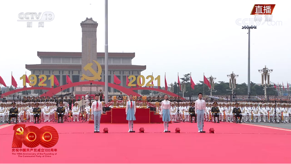 2021年7月1日,庆祝中国共产党成立100周年大会在北京天安门广场隆重举行,共青团员和少先队员代表在集体致献词时高呼口号:请党放心,强国有我