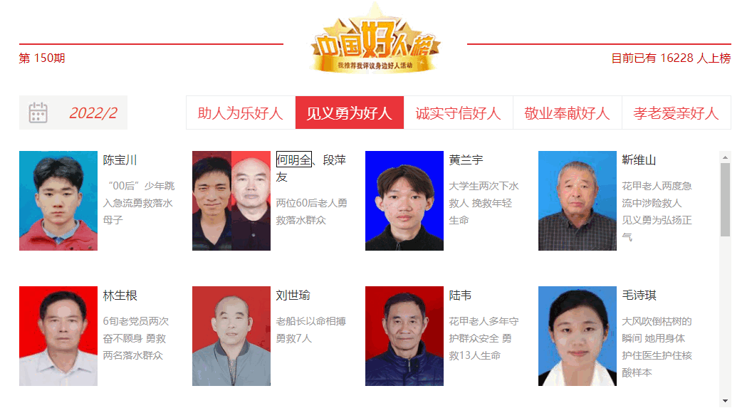 2008年起,中央文明办组织开展网上“我推荐我评议身边好人”活动,至今已发布“中国好人榜”150期,共有16228人(组)入选“中国好人”。