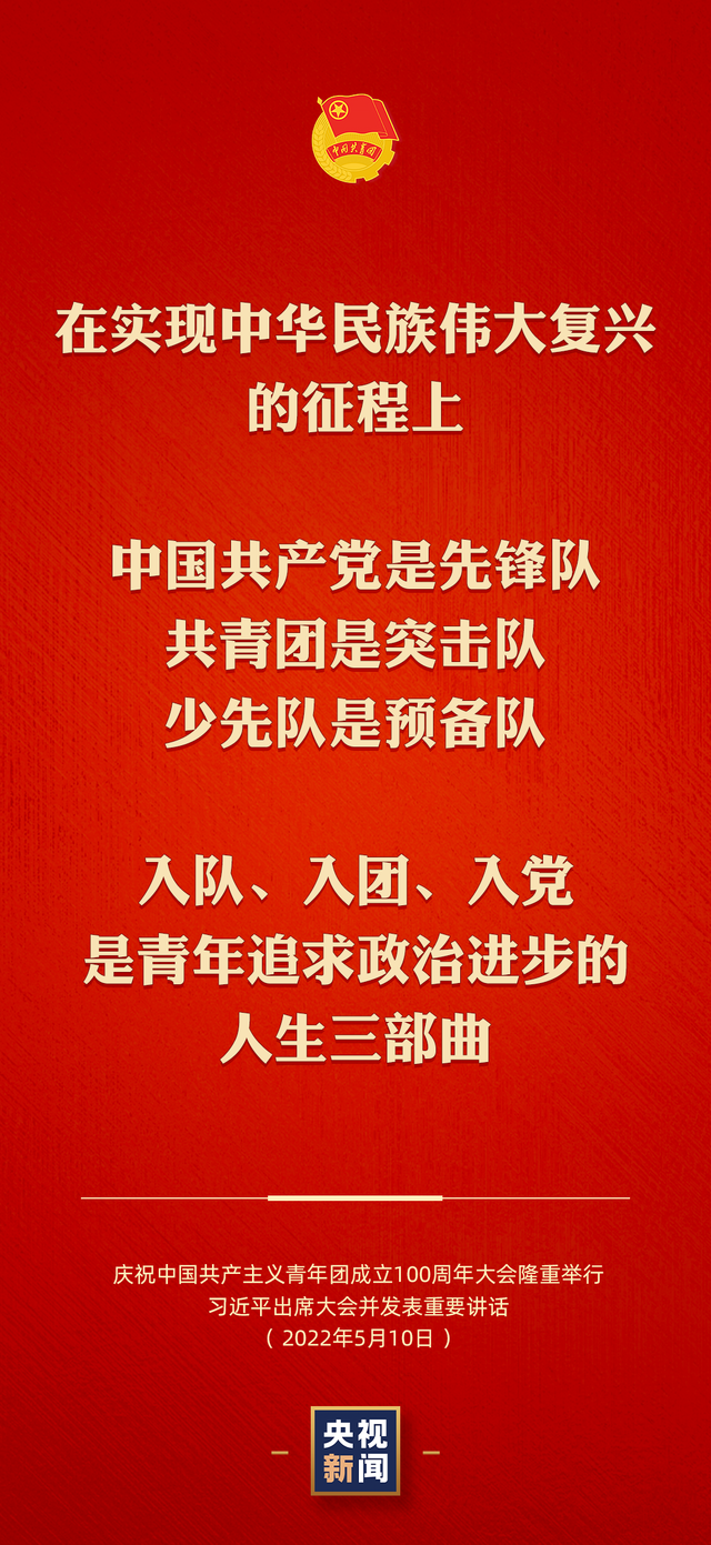 2022年5月,习近平总书记在庆祝中国共产主义青年团成立100周年大会上指出:在实现中华民族伟大复兴的征程上,中国共产党是先锋队,共青团是突击队,少先队是预备队。入队、入团、入党,是青年追求政治进步的“人生三部曲”。