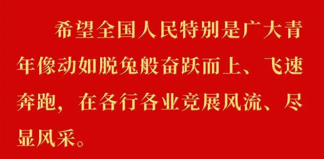 在中华传统文化中,兔被称为瑞兔、玉兔,代表着机智敏捷、纯洁善良、平静美好。吉兔呈祥,象征中华大地愈发安宁祥和、生意盎然、朝气蓬勃。在农历兔年,希望全国人民特别是广大青年像动如脱兔般奋跃而上、飞速奔跑,在各行各业竞展风流、尽显风采。
