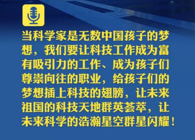 “当科学家是无数中国孩子的梦想,我们要让科技工作成为富有吸引力的工作、成为孩子们尊崇向往的职业,给孩子们的梦想插上科技的翅膀,让未来祖国的科技天地群英荟萃,让未来科学的浩瀚星空群星闪耀”。——2018年5月28日,习总书记在中国科学院第十九次院士大会、中国工程院第十四次院士大会上的讲话。