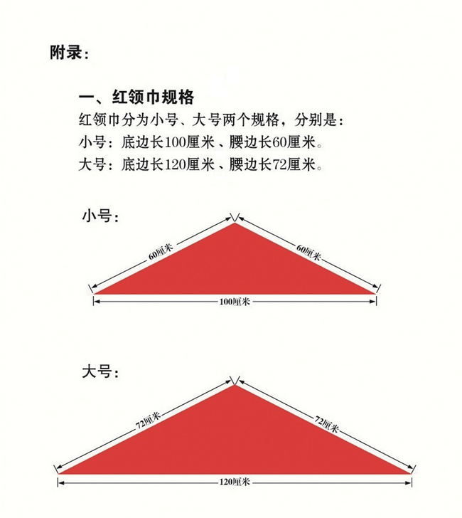 2.小学低、中年级队员佩戴小号红领巾,小学高年级和初中队员佩戴大号红领巾。小学低、中年级身高较高的队员,可佩戴大号红领巾。少先队员离队时应珍藏红领巾和队徽徽章。
