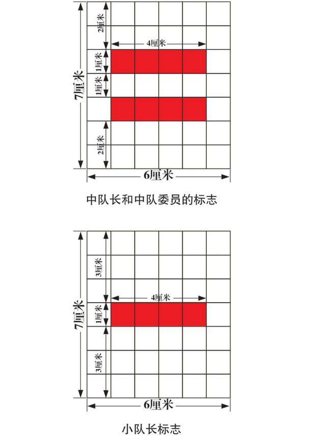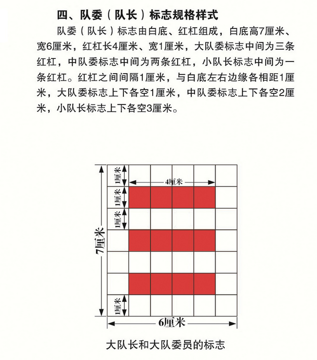 队委(队长)标志由白底、红杠组成,白底高7厘米、宽6厘米,红杠长4厘米、宽1厘米。大队委标志中间为三条红杠,中队委标志中间为两条红杠,小队长标志中间为一条红杠。红杠之间间隔1厘米,与白底左右边缘各相距1厘米。大队委标志上下各空1厘米,中队委标志上下各空2厘米,小队长标志上下各空3厘米。