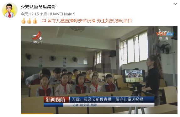 今天,冬瓜哥哥在微博上转发了一条消息:留守儿童直播母亲节祝福,务工妈妈感动泪目。