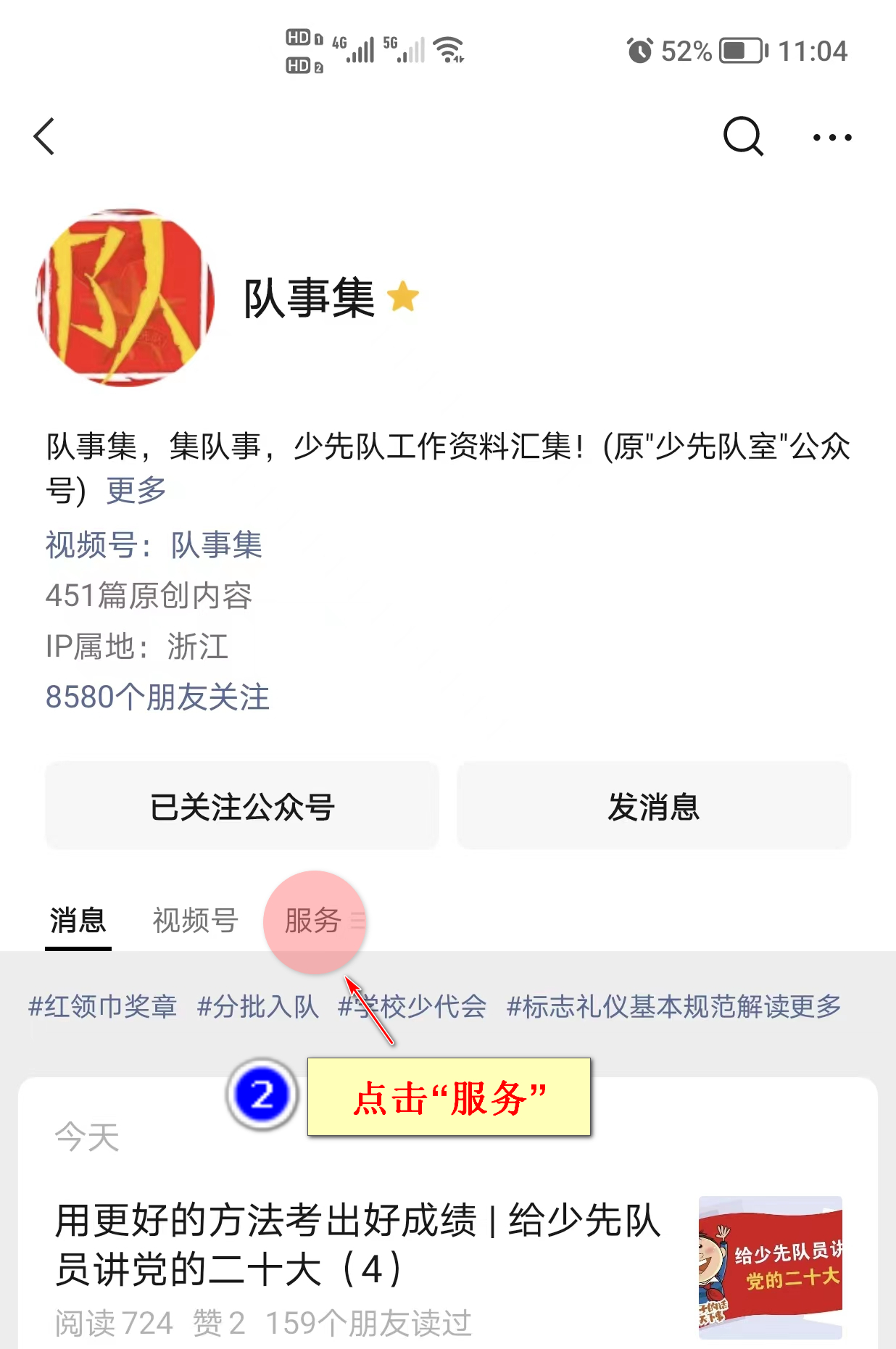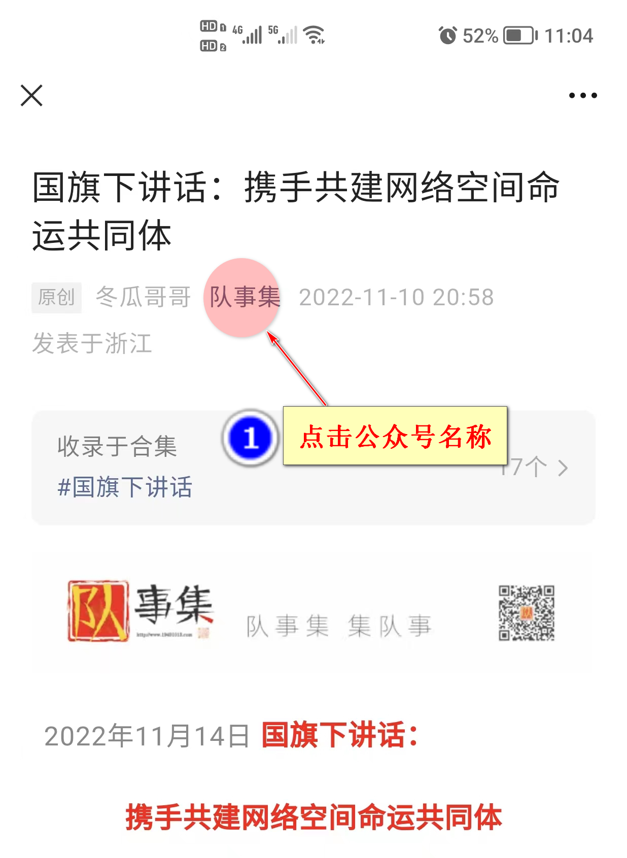 方法二:1.在公众号文章界面,点击标题下公众号名称“队事集”