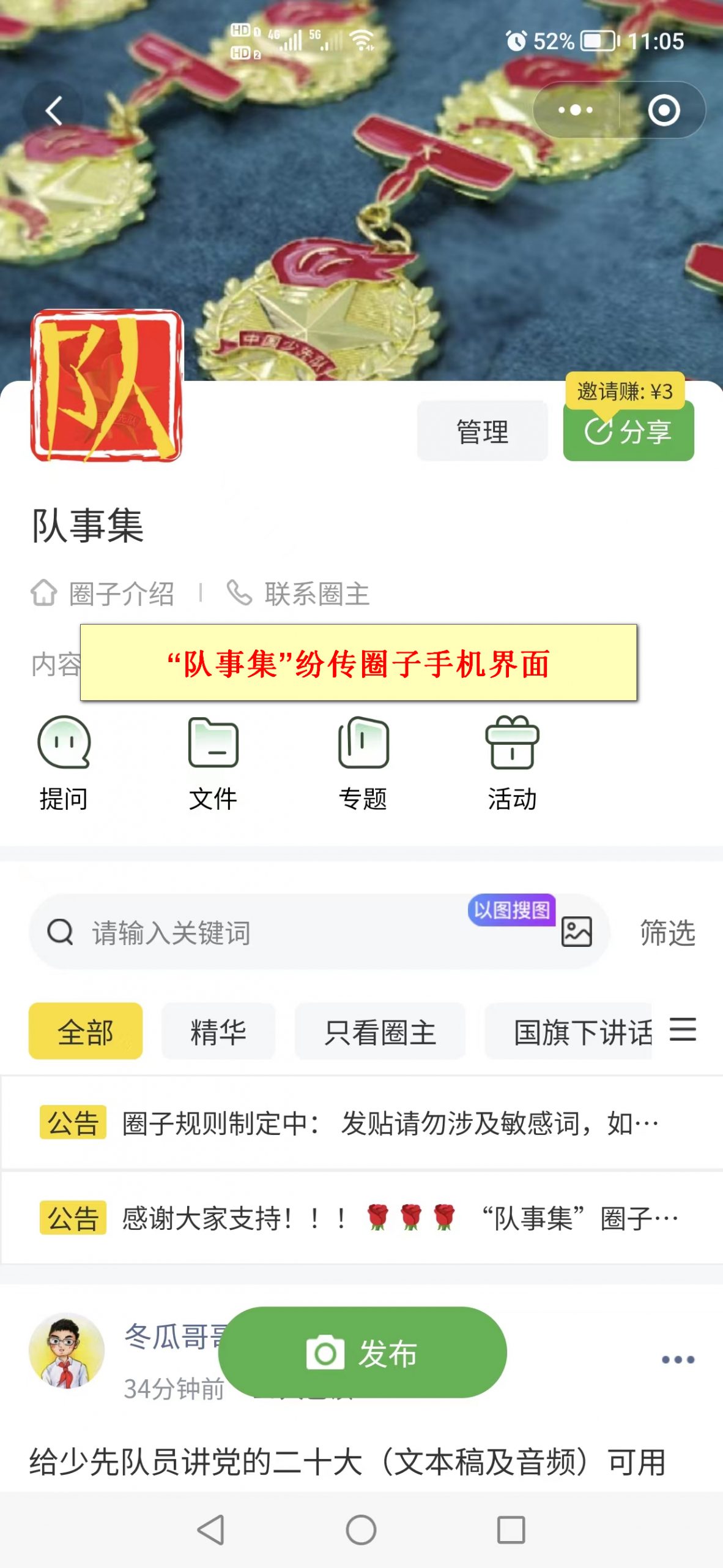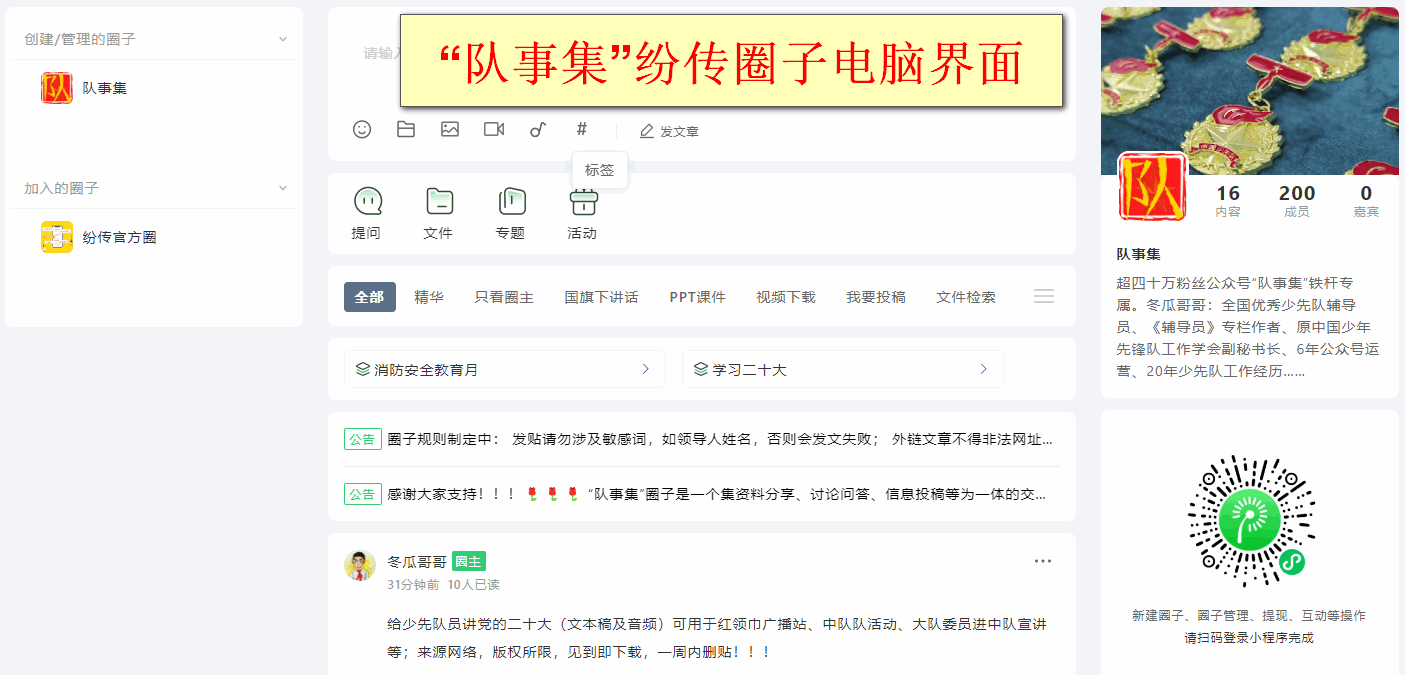 “队事集”纷传圈子是具有集资料分享、讨论问答、信息投稿等为一体的交流平台(功能类似于论坛)。是“队事集”公众号自2023年起(2022年11月中旬起试运行)开展的精准服务计划,初期目标是达成千人千校的服务规模。