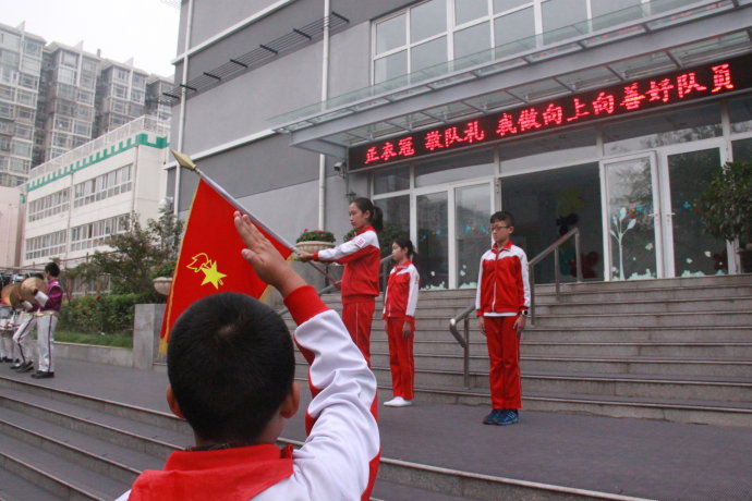 少先队员敬好队礼,有点类似军队战士的军容军姿,体现平常训练的水平和战斗力。