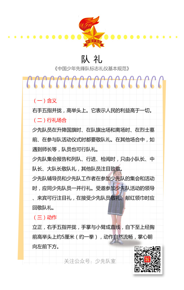 2017年9月,《中国少年先锋队标志礼仪基本规范》正式出台,其中对“敬好队礼、践行队礼精神”作出非常清楚的规定: