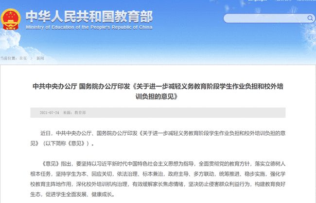 近日,中共中央办公厅、国务院办公厅印发了《关于进一步减轻义务教育阶段学生作业负担和校外培训负担的意见》,引发热议。