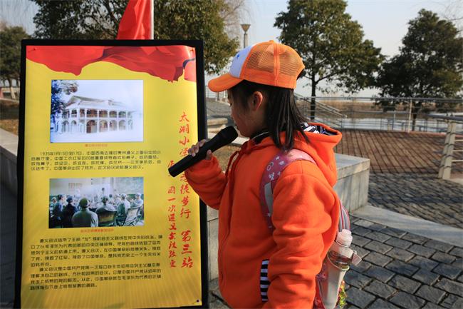 参与活动的200多名大大小小的“红军战士”,迈着整齐的步伐,昂首挺胸走上“长征路”。他们经太湖大道,沿滨湖大道折返,再行至发展大道,回到学校,总路程8公里。据悉,该校在长征路上设置了七个站点,分别代表“瑞金”、“湘江”、“遵义”、“赤水”、“金沙江”、“大渡河”及“会宁”,并在每个站点,设置画报,有相关故事介绍。