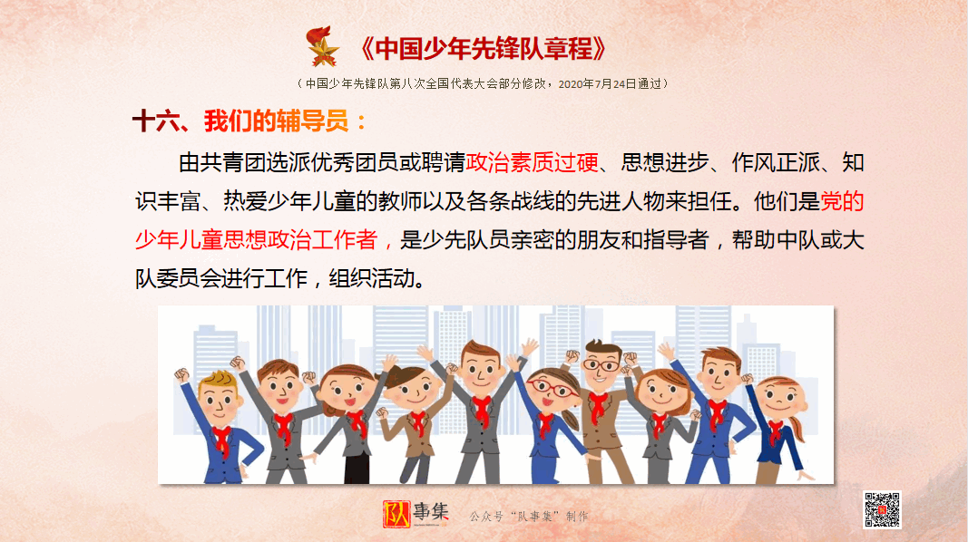但是,依照2020年2月27日,共青团中央、教育部、人力资源社会保障部、全国少工委印发《关于加强新时代少先队辅导员队伍建设的意见》,有两点需要把握: