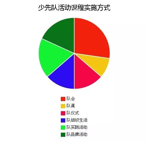 《少先队活动课程指导纲要》(试行版)指出,少先队活动课程的实施方式主要有:队会、队课、队仪式、队组织生活、队实践活动、队品牌活动。