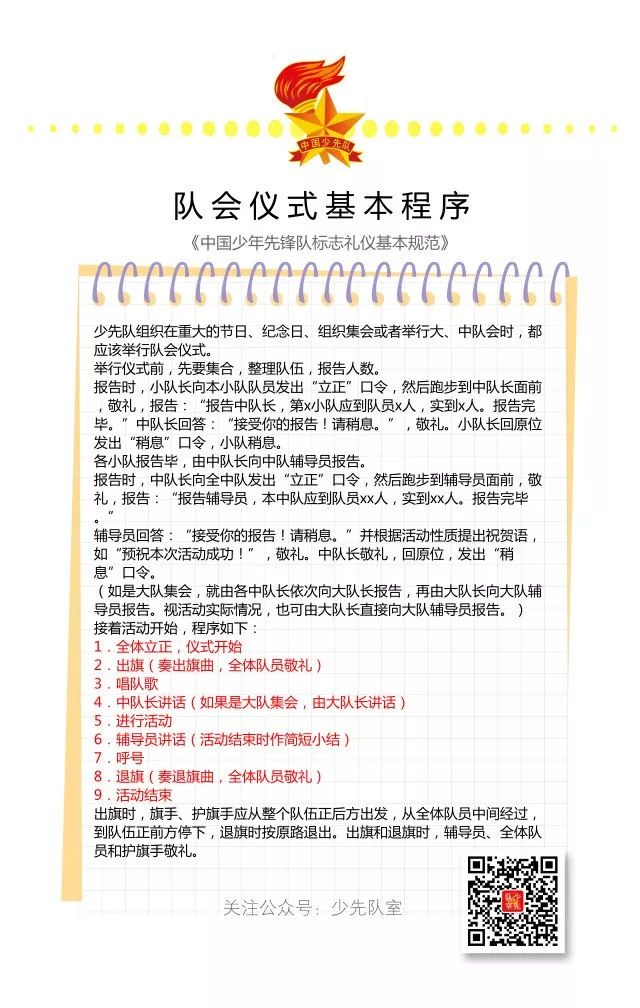 少先队举行队会有基本程序与礼仪规范,《中国少年先锋队标志礼仪基本规范》在第九条中加以明确: