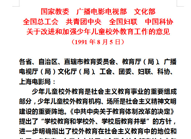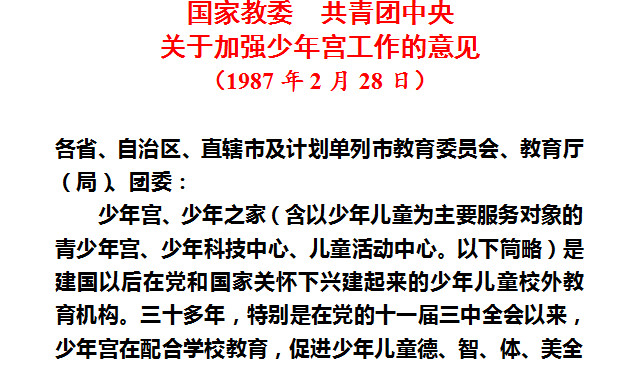 之后,随着中共中央教育体制改革等新形势新情况,国家教委、共青团中央等部分又分别在1987年、1991年发文,就校外教育活动设施和场所(如少年宫、少年儿童活动中心、少年科技中心(馆、站)、艺术馆、儿童影剧院、儿童公园、少年儿童图书馆、阅览室、少年体校等)的建议和发展提出指导意见。