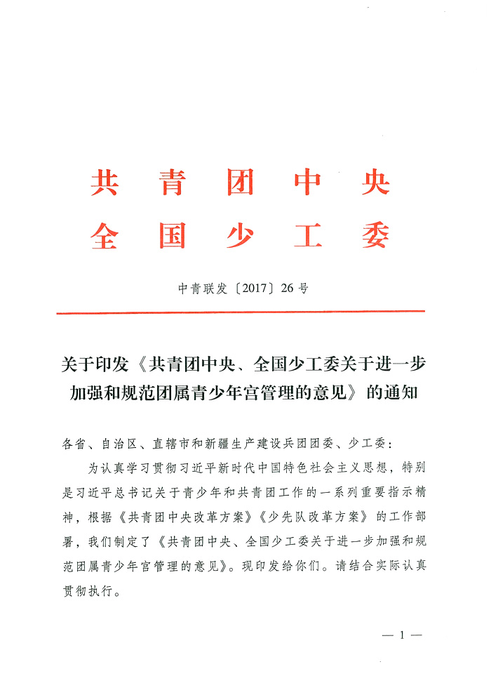 2017年12月,共青团中央、全国少工委发布《关于进一步加强和规范团属青少年宫管理的意见》