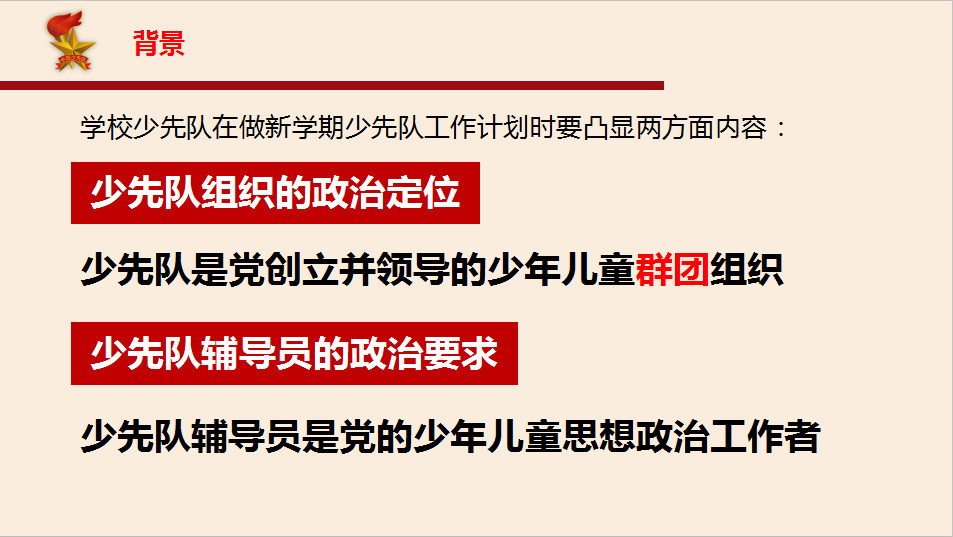 因此,学校少先队在做新学期少先队工作计划时要凸显两方面内容: