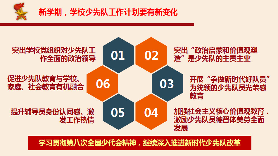 以“学习贯彻第八次全国少代会精神,继续深入推进新时代少先队改革”的总体思路,进行新学期学校少先队工作策划时,可以注重以下六个方面: