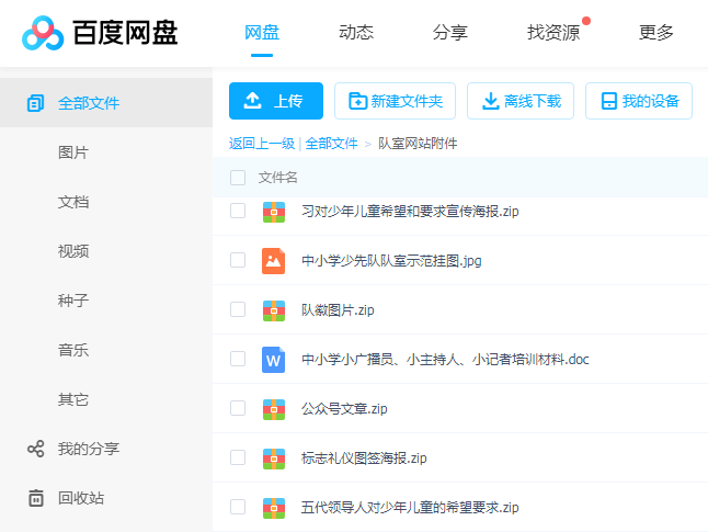 分为音乐、视频、图文、PPT文稿、少先队工作文件等分类。