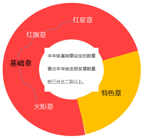 而基础章是必修章,也是红领巾奖章的核心章目,特色章是基础章的有益补充。本年级基础章设定的数量要占本年级全部奖章数量的三分之二及以上。