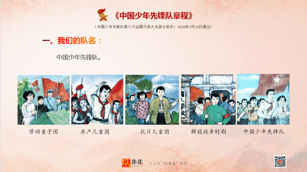 最终1949年10月13日公布的《中国少年儿童队章程草案》中第一条又定名为中国少年儿童队。