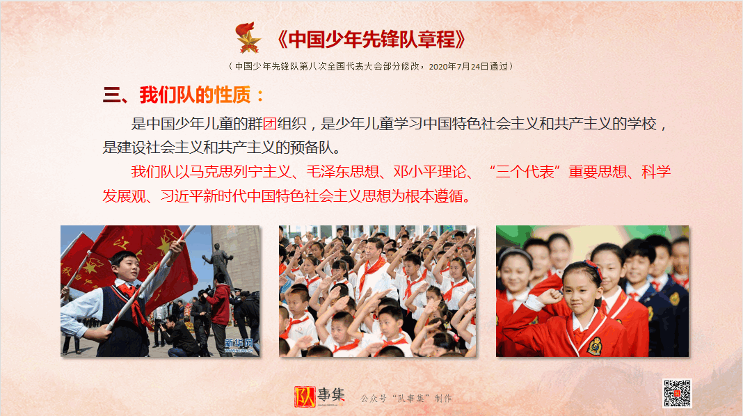 2020年7月第八次少代会修改之前的很长一段时间,“我们队的性质”都表述为“是中国少年儿童的群众组织,是少年儿童学习中国特色社会主义和共产主义的学校,是建设社会主义和共产主义的预备队。”