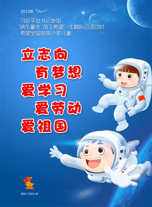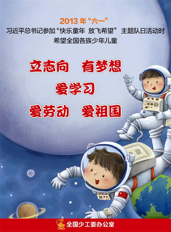 2013年“六一”,习近平总书记参加“快乐童年 放飞希望”主题队日活动时希望全国各族少年儿童:立志向,有梦想,爱学习,爱劳动,爱祖国。
