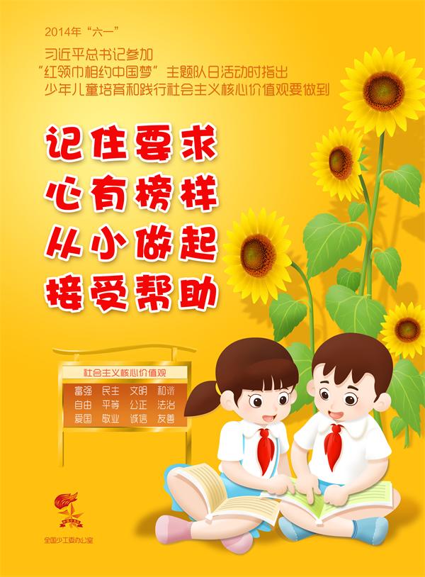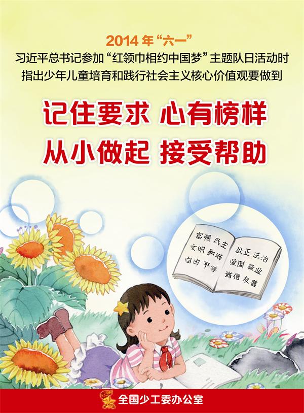 2014年“六一”,习近平总书记参加“红领巾相约中国梦”主题队日活动时指出少年儿童培育和践行社会主义核心价值观要做到:记住要求,心有榜样,从小做起,接受帮助。