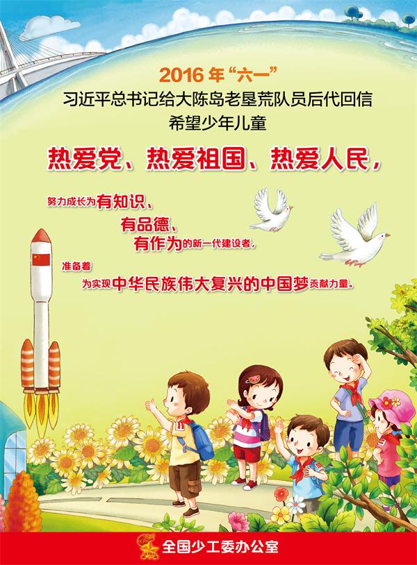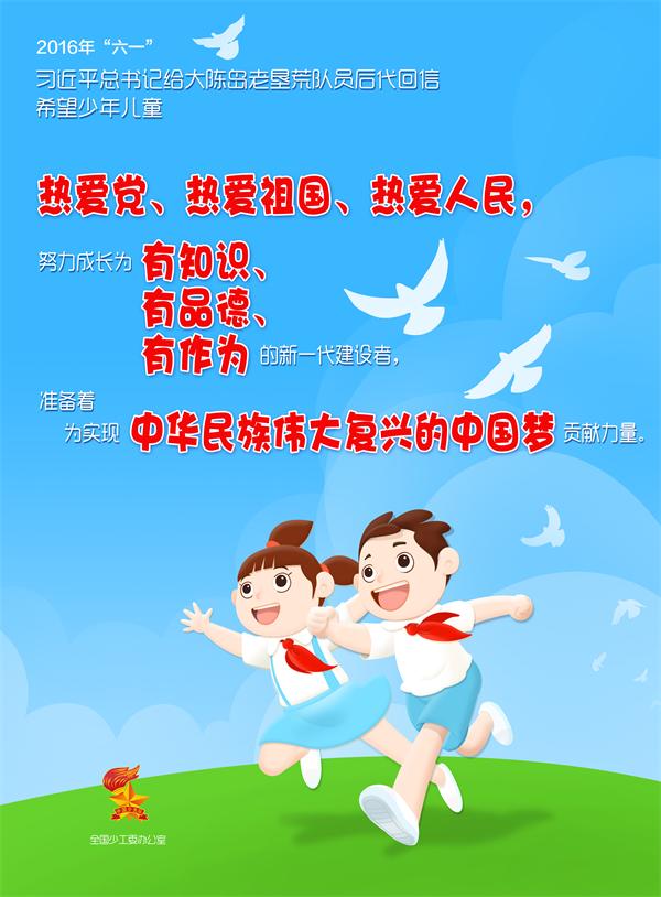 2016年“六一”,习近平总书记给大陈岛老垦荒队员后代回信,希望少年儿童:热爱党、热爱祖国、热爱人民,努力成长为有知识,有品德,有作为的新一代建设者,准备着,为实现中华民族伟大复兴的中国梦贡献力量。