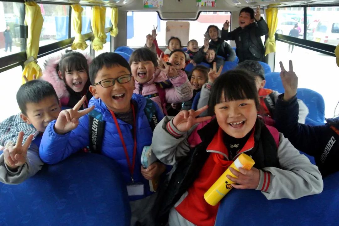 ↑陕西照金北梁红军小学学生在校车上合影(2018年12月4日摄)。新华社记者 梁爱平 摄